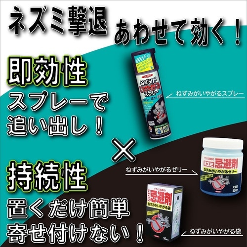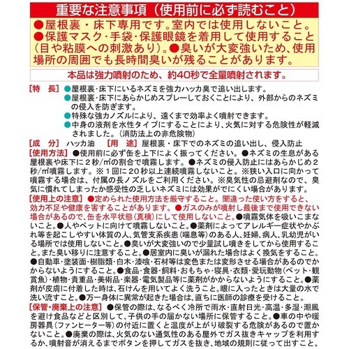 強いハッカ臭でネズミを追い出す!〈スプレータイプ〉屋根裏・床下にいるネズミを強烈なハッカ臭で追い出します。屋根裏・床下にあらかじめスプレーしておくことにより、外からネズミの侵入を防ぎます。主成分は天然 |