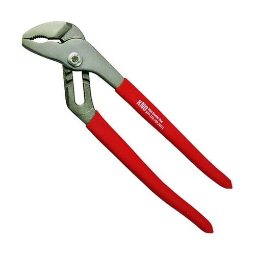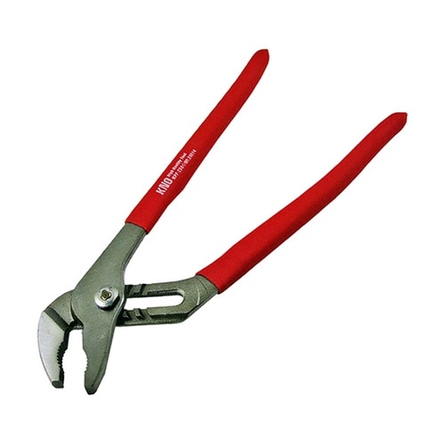 口の開き幅が5段階で調整可能な溝付きウォーターポンププライヤー名前の通り、水道管など管もつかみやすい口部形状です。滑りにくいノンスリップタイプのレッドグリップ |