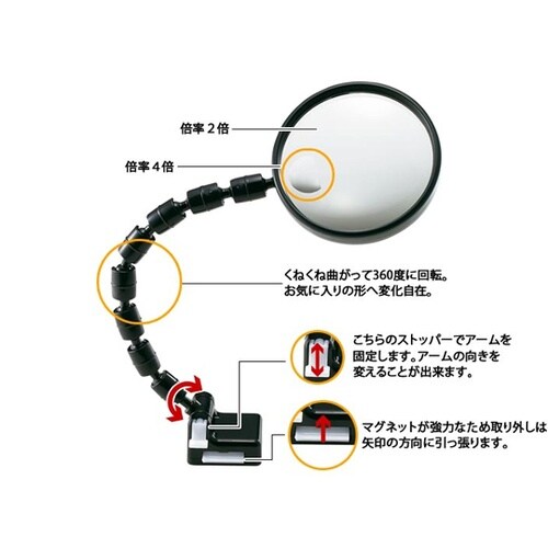 読書・彫刻・精密部品の組立などその他、細かい作業に便利です。台がマグネット式なので金属のところなら何処でも取り付け可能。 |