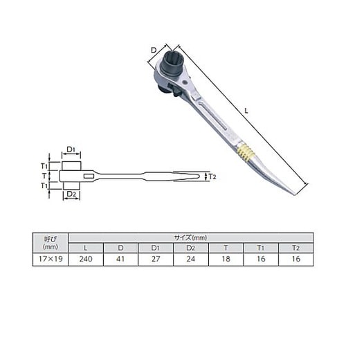 17x19mm/240mm 両口ラチェットレンチ(曲りシノ付/ショート EA602AT−101