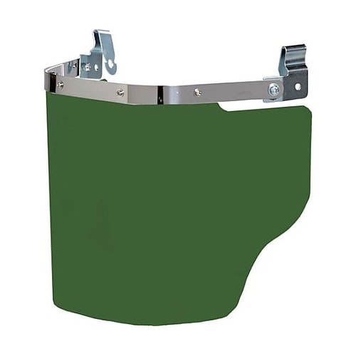 耳まで覆う大型防災面のため、顔だけでなく耳まで保護できます。アダプター併用でさまざまなヘルメットに取付可能です。正面が平らな角型レンズです。化学工場・薬品・グラインダー作業。 |