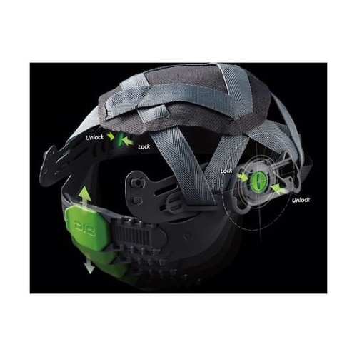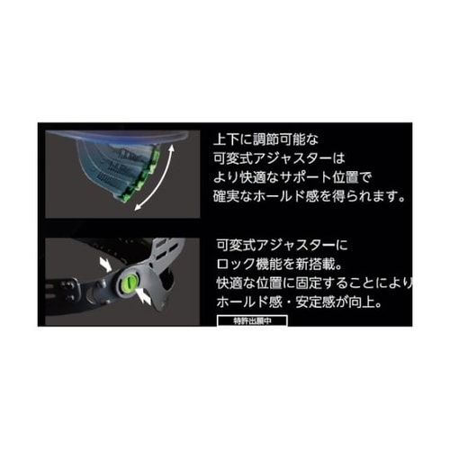 角度可変式アジャスターにロック機構を新搭載しました。快適な位置に固定することにより、ホールド感・安定感が向上しました。飛来・落下物用。墜落時保護用。 |