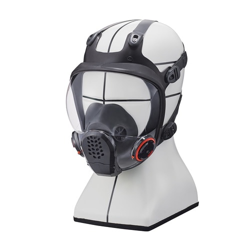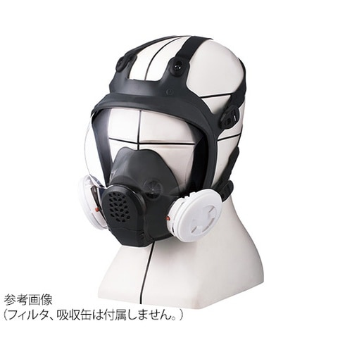 防じんマスクと防毒マスクの両方の国家検定に合格しているため、作業環境に応じてフィルタ又は吸収缶のどちらも取付けられます。伝声器付きで、マスクを付けたままでも会話が明瞭です。広視野(アイピースを4つの球 |