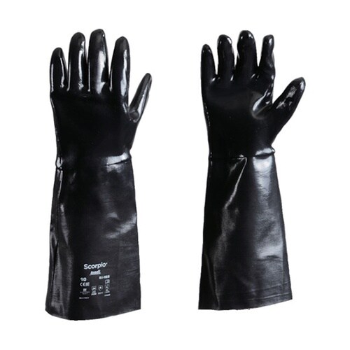 油、酸、アルコール、腐食剤、溶剤などから手を守ります。長袖タイプのため保護範囲が広いです。化学薬品の取り扱い。機械設備を使用する作業。 |