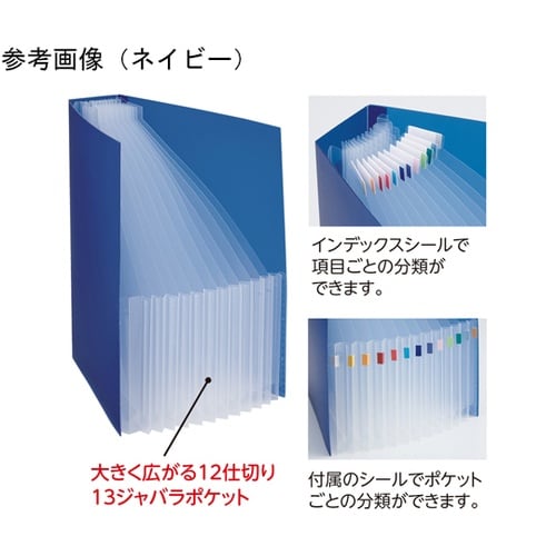 大きく広がって、書類を検索しやすい自立式のジャバラポケットファイル。A4クリヤーホルダーも収容できます。検索しやすい見出し付きインデックスシールで項目ごとの分類ができます。見出し紙裏面は書き込みでき、 |