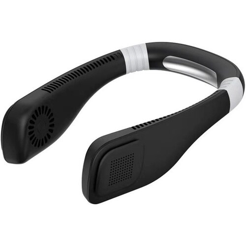 首に掛けることで両手での作業が可能です。ファン先端から吸い込んだ空気を首筋に沿って吹き出すので風が邪魔になりません。風量は3段階切替えが可能です。首の根元にステンレスヒートシンクを搭載。 |