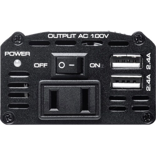 車のアクセサリソケットに家庭用コンセントとUSB電源ポートを設置できるカーインバーターです。AC差込口を1個、USBポートを2ポート搭載しています。USBポートは、2ポート合計で最大4.8Aの出力が可 |