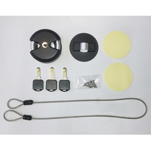 ネジ止めと両面接着テープの両方に対応した、シリンダー錠を内臓したワイヤー錠です。錠前機能を持ったシリンダー錠本体とワイヤー・チェイン等をつなぐ固定プレートとの組み合わせで様々なモノ同士を「つなぐ・止め |