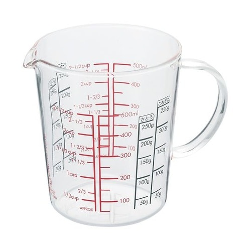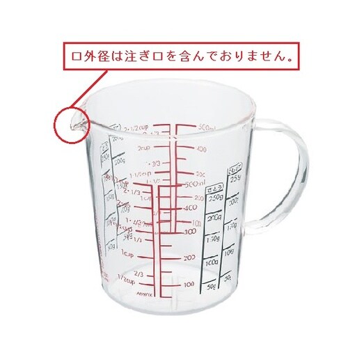 中から見える目盛り(上からのぞいた時に見やすくはっきり見える目盛り)です。液体だけでなく粉体の目盛りもついてます。電子レンジにも対応しています。 |