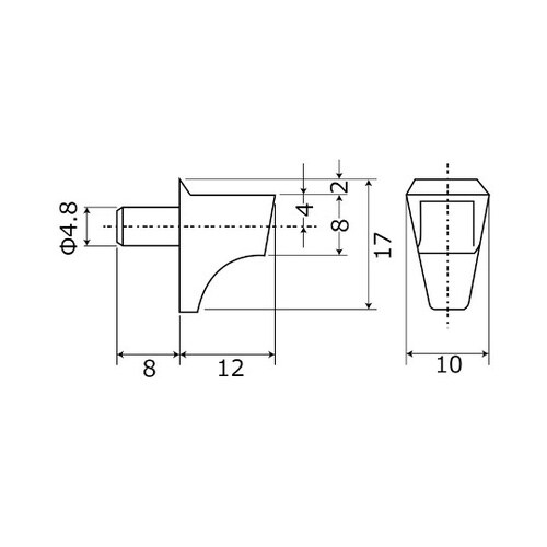 棚ダボは家具内の移動棚を四隅で支える金具です。家具の側板に棚ダボの受穴を設けそこに棚ダボを差し込んで使用します。