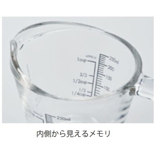 内側から見えるメモリがポイント。計量カップを使うときの目線を考え、上からのぞいたときに見やすくはっきり見えるメモリをつけました。液体だけでなく「さとう」「こむぎこ」のメモリも付いています。耐熱ガラス製 |