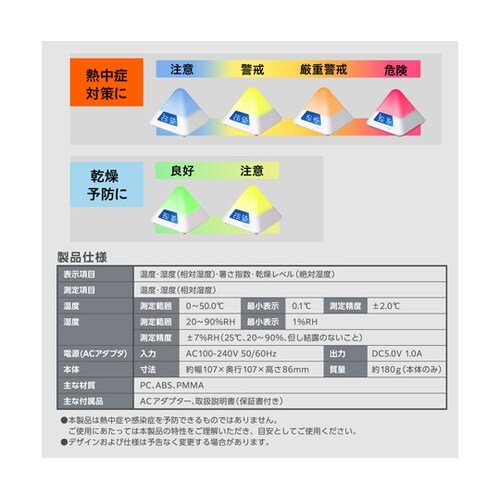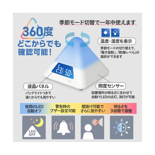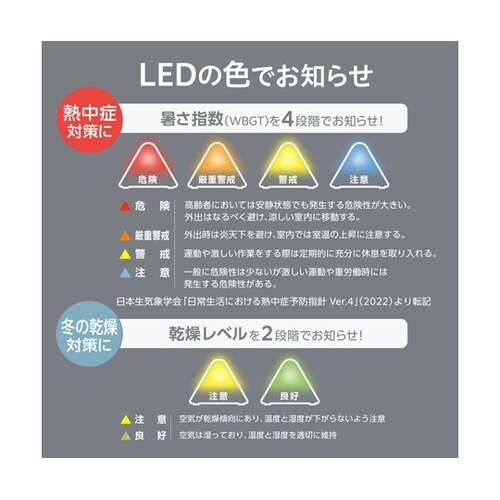 室内環境(温度または湿度)を遠くからでも分かりやすくLEDの色でお知らせ。熱中症、乾燥予防の目安に。季節モード切替で夏は熱中症対策(暑さ指数表示)、冬は乾燥予防(乾燥レベル表示)として一年中使用するこ |