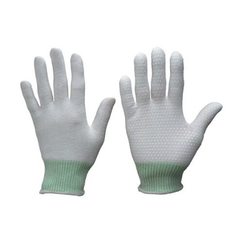 シリコン樹脂をドット加工することにより、すべり止め効果を発揮します。低発じんで、通気性に優れた耐切創手袋です。使い捨て手袋のインナーとして使用すると、アウター手袋がずれ落ちることを防ぎます。すべり止め |