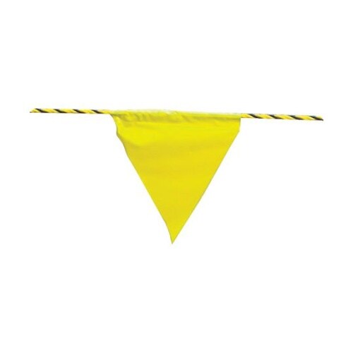 標識ロープと旗のセットで効果的に警告を発信します。標識ロープに三角形の旗が付いています。両端より2m、旗間隔1.5mで5枚付いています。注意喚起、警告喚起、安全確保、環境整備を促すのに最適。 |