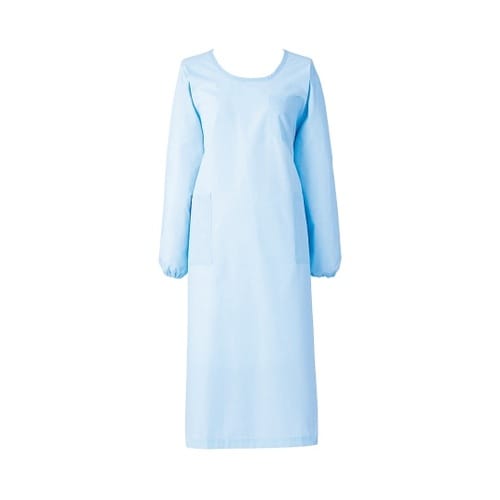 首ひもで調節可能なミドル丈エプロン。軽くて通気性がよく、長時間着用しても疲れません。袖口ゴム入り