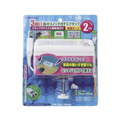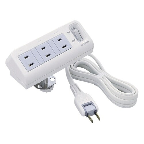 ネジ式クランプでデスク等に簡単に取り付けできます。差込口が斜めになっていますので、正面からのプラグの抜き差しが簡単に行えます。コードが下向きに出ていますので、机と壁の狭い所でもスッキリ配線ができます。 |