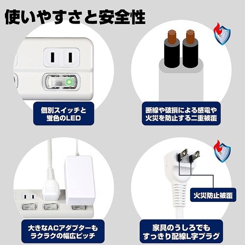 ホタル色LEDランプ仕様 独立スイッチ本体は衝撃に強い 難燃性ABS樹脂採用差込口は熱やトラッキングに強いユリア樹脂採用差し込みやすい上差しタイプACアダプターも使えるゆったりスペースコードは保護被ふ |
