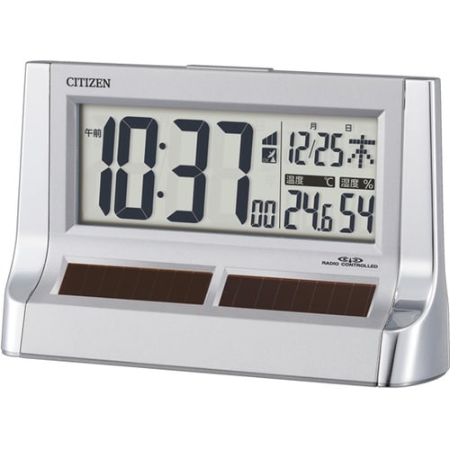 シースルー液晶のデジタル電波時計です。光発電で動くソーラー電源を備えています。数字サイズ(縦)37mmの見やすい大型表示です。置用です。時間・日時・曜日・温度・湿度を一目で確認出来る画面は残照機能付き |