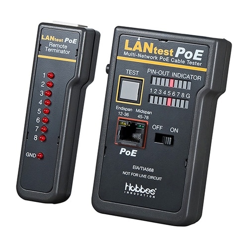 ケーブルの導通・断線・結線ミスが簡単にわかる、PoE対応のLANケーブルテスターPoEの有無を数秒で確認できます。電圧が12−36V(Aclass接続)または45−78V(Bclass接続)のどちらで |