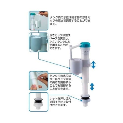 浮玉部がガイドを軸に上下するためスムーズな動きで吐水・止水できます。下給水用の万能ロータンクボールタップです。取付が簡単なさく楽ナット付です。最大100mmまで水位調節が可能です。手洗なしの下給水用で |