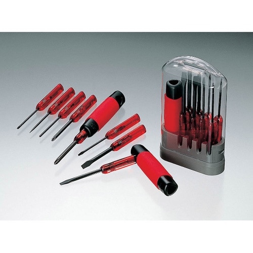 プロの方にも対応する高級型ドライバーセット。マスターハンドルは手になじむエラストマー樹脂採用。軸も最高級のクロームバナジウムモリブデン鋼使用で高強度を実現。 |