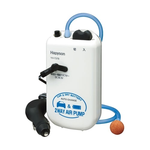 車に乗っている時はカー電源、釣場では乾電池で使えるから活餌釣りに適した2WAYのエアーポンプ。車のエンジンを切ると、自動で電源が乾電池へ切り換わる。 |