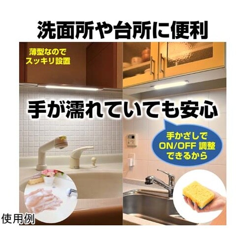 非接触スイッチに手をサッとかざすだけで電源をON/OFF、手をかざし続けると最大(100%)−最小(約10%)の間で無段階調光できる。別売の連結子機(31cm)を3台まで連結可能。 ※61cmの連結子 |