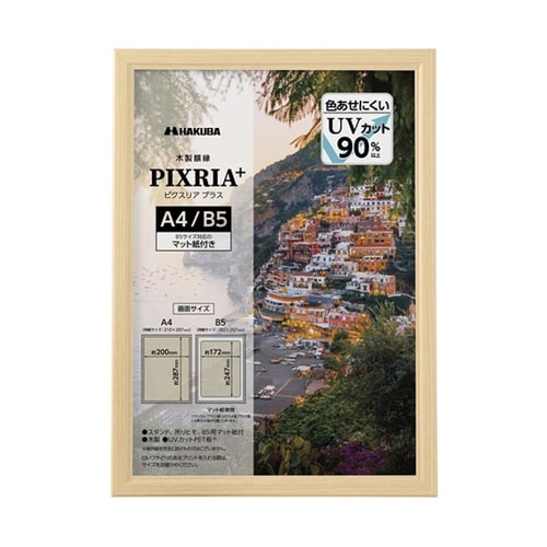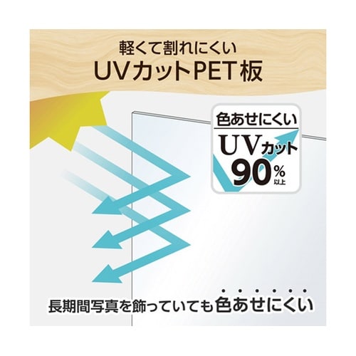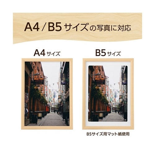 シンプルなデザインでUVカットPET板を使用したA4サイズ用の木製額縁B5サイズも飾れるマット紙(中額)付き。 |