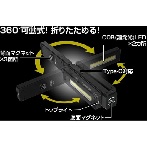 折り畳みできるバーライト。トップライト&メインライトで隙間から広範囲まで使えるUSB充電式COB LED:多数のLEDチップを密集して基板に直接実装した光源。多灯式に比べ多重影ができにくく、照射範囲も |