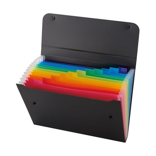 書類が検索しやすく、出しやすい12色のグラテーションが美しいレインボーカラーのドキュメントファィル12色の仕切のグラテーションが映える、スタイリッシュで高級感を演出するブラック。個人情報保護にも最適。 |