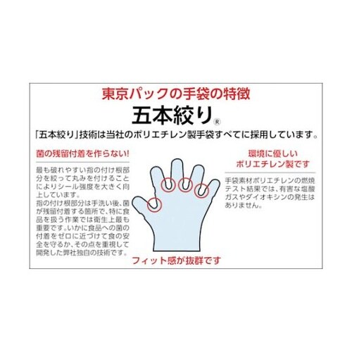 五本指の付け根に絞りを入れてフィット感を向上、作業中のずれ、脱落を防ぎます。環境に優しいポリエチレン製です。高品質で衛生的な国産品です。食品加工。洗浄作業。 |