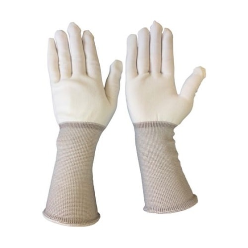 スーパーロングタイプで手首までしっかりとカバーができます。毛羽が少ない長繊維仕様です。クリーンルーム、精密作業に。 |