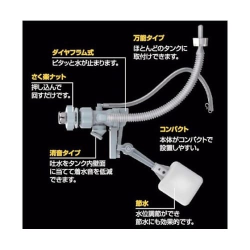 下給水・ハイタンクを除くほとんどのロータンクに対応する万能タイプです。機能性と節約のバランスを調整したボールタップです。水位調節ができ、節水に効果的です。押し込んで回すだけ、取付が簡単なさく楽ナット付 |