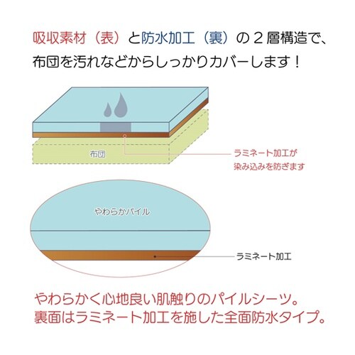 柔らかく肌ざわりのよいパイル素材。高い防水性で、ベッドや布団を汚れからしっかりガードします。ムレもなく快適です。耐久性もよく、繰返しのお洗濯や乾燥にも丈夫です。 |