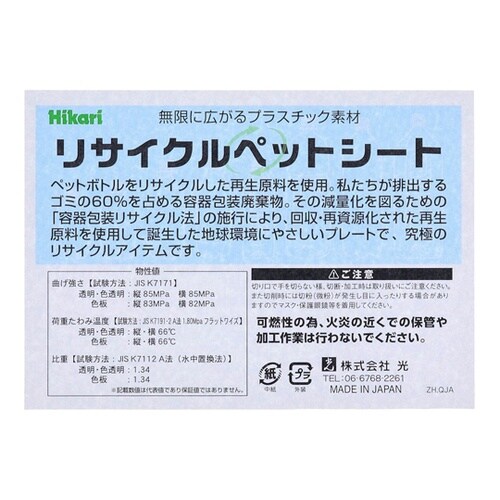 使用済ペットボトルを100%再利用し環境に配慮した樹脂板製品。ホビー用工作材。掲示板、ディスプレイなど。一般雑貨として。切り口で手を切らないよう切断、加工時には取り扱いにご注意ください。可燃性のため、 |