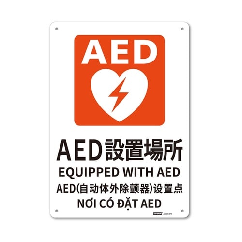 安全標識板(多言語表記・HIPS) AED設置場所 254×356mm J2689−PM