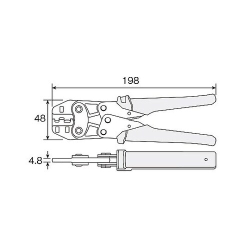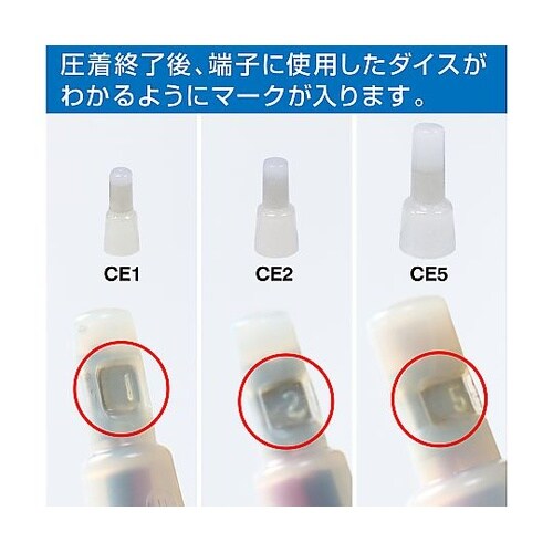 絶縁閉端子用CE1/CE2およびCE5が圧着可能です。コンパクトながら、軽い握りで圧着できます。圧着終了後、端子に使用したダイスがわかるようにマークが入ります。 |