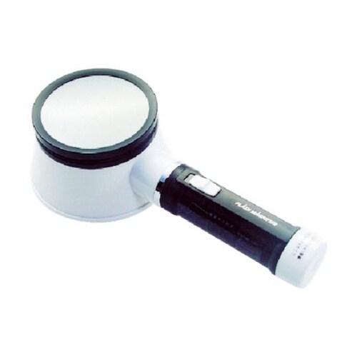 LEDライトが付いた、測定や点検に便利な高倍率ルーペです。レンズはガラス1枚です。直径80mmのワイドレンズです。暗い場所での検査に。 |
