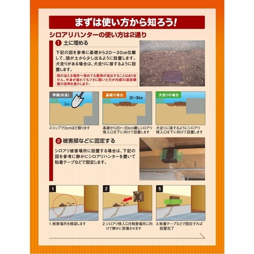 巣に持ち帰らせてアリ、巣もまとめて駆除!巣ごと駆除するタイプのシロアリ駆除剤です。被害場所や生息場所、出没しやすい所に簡単設置。土に穴を掘って埋めたり、養生テープなどで固定するだけなので、家庭で簡単に |