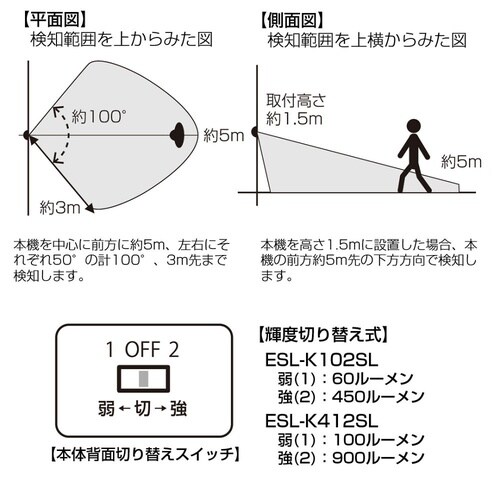 暗い時にセンサーが人や車の動きを検知して自動点灯スイッチで点灯モードを「強」と「弱」に選択できます。本体側面にもLEDを搭載しているので広範囲を照射ソーラー発電式なのでコンセントがない場所に設置できて |