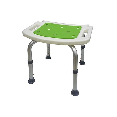 軽くて、サビにくいアルミフレーム。座面マット付きで座り心地がやわらかい。滑りにくいゴムキャップ仕様。シャワーヘッドを掛けられる座面形状。 |