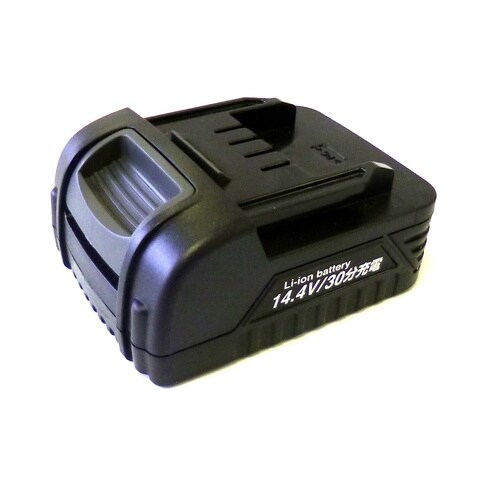 新興製作所製インパクトドライバーDCID−1415Wや電動のこぎりDCES−1415を始め、充電式シリーズのバッテリーです。リチュウムイオン電池パックで、充電時間は約30分です。 |