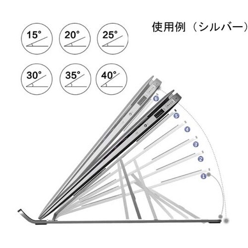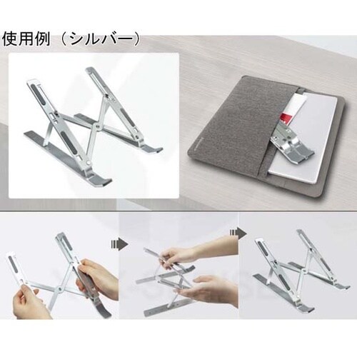 ノートパソコンやタブレットに対応し、使いやすい角度に調節可能です。本体接地面が少ない為、パソコンの排熱にも効果的です。折りたたみ可能で、収納や持ち運びに適してます。持ち運びに便利な収納袋がついてます。 |
