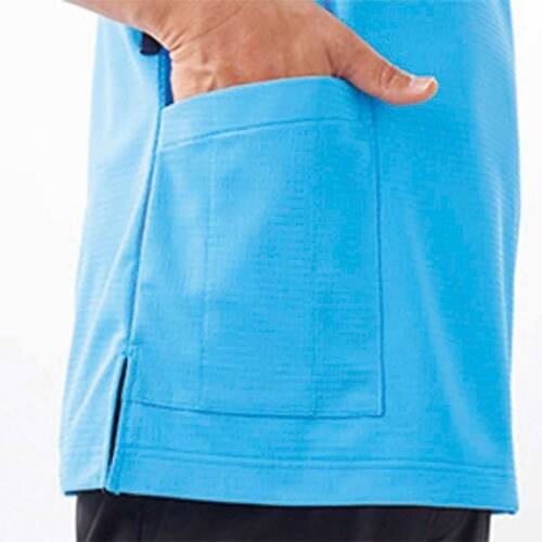 清涼素材でさらっとした着心地です。スマートフォンが収納できる大きめの胸ポケット。右胸にブランドロゴ刺しゅう入り。大きめの腰ポケット。たるみ防止の為ポケットの中央を補強しています。右脇に便利なキーループ |
