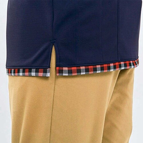 衿元のスナップボタンで着脱が簡単。安心の胸当て付き。たるみ防止の為ポケットの中央を補強しています。重ね着風に切替えた裾まわり。動きやすいスリット入り。ニット素材で表現した親しみやすいブロックチェック柄 |