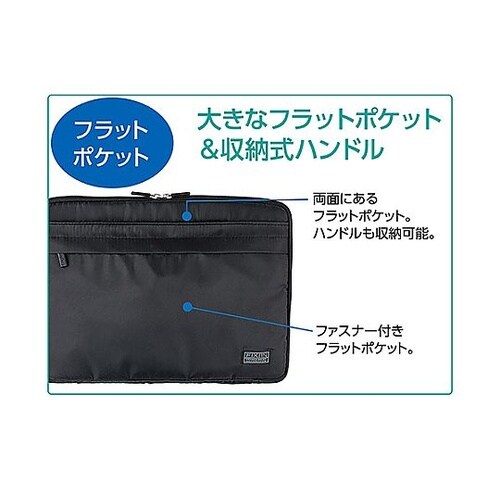 スリム&軽量設計180°に大きく開き出し入れが便利かさばらないスリム形状大きなフラットポケット&収納式ハンドル内部クッション入りでPCをしっかりガード内側はキズをつけにくい起毛素材を使用。 |