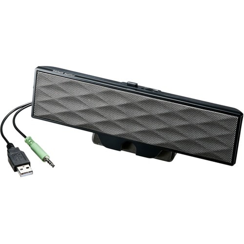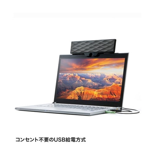 ノートパソコンやタブレットの画面上部に固定でき、USBケーブルで電源供給できるUSB電源方式のサウンドバースピーカーです。様々な厚みのノートパソコンに装着できるクリップ付き、最大25mm幅まで装着可能 |