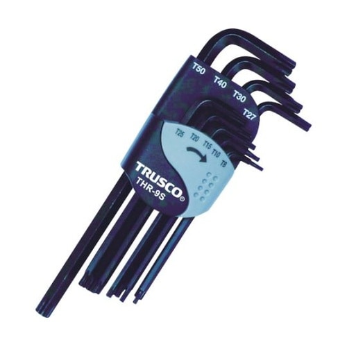 ホルダが回転でき、各サイズのレンチの出し入れがしやすいです。先端は穴付き形状でいじり止めトルクスネジにもに対応します。硬度はHRC55−60です。 |