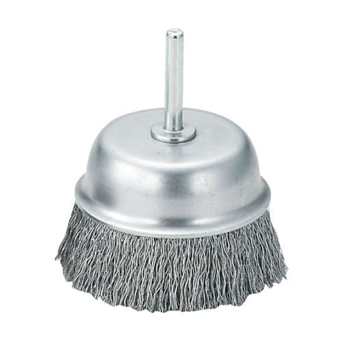 カップ型をしているため、比較的広面の作業に適しています。金属面の研磨、サビ落とし、バリ取り、塗装はく離など。使用工具:ドリル・卓上ボール盤。(最高使用回転数以下で使用してください)