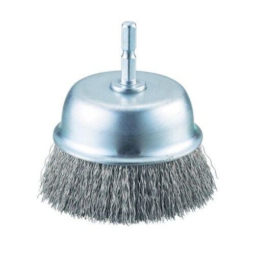 六角軸付のカップ型ブラシブラシ形状がカップ型で、下面に向かって毛が植わっています。比較的広い面の作業向きです。金属面などのバリ取り、研磨、洗浄など。